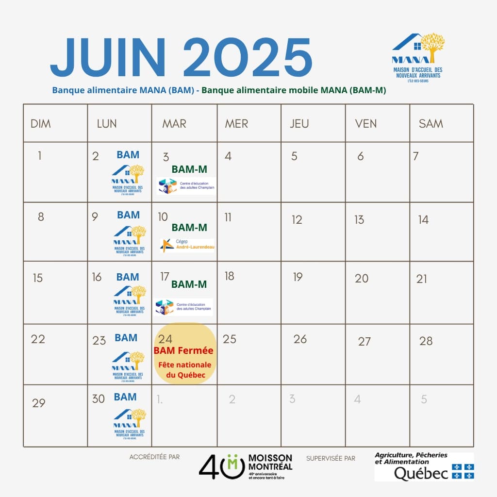 La banque alimentaire de la MANA distribue un panier hebdomadaire pour un coût symbolique de 7$. Notre banque est située au sous-sol de l’église Ste-Marguerite-Bourgeoys, 286, rue Elgar, Verdun QC H3E 1C9 (L'île-des-Sœurs). Nous servons en moyenne 118 familles à chaque semaine. La MANA est heureuse de contribuer à une alimentation équilibrée de personnes en cours d’intégration sur l'île-des-Sœurs et quartiers environnants. Le service est ouvert uniquement le lundi.